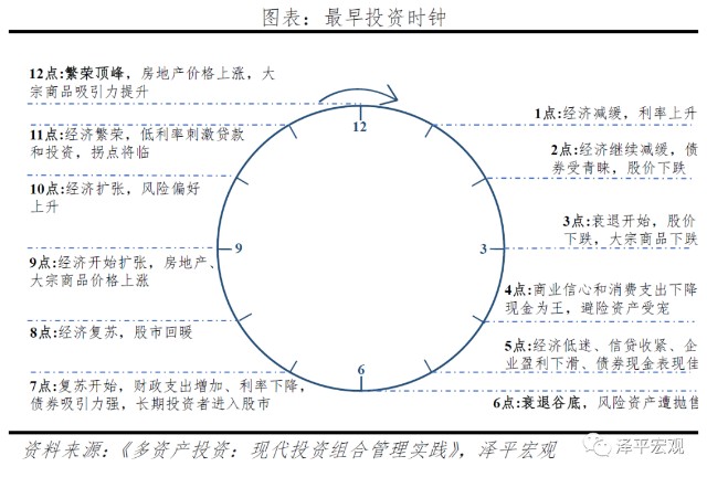 在衰退期:经济下行,产出缺口恶化,通胀下行。货币政策趋松,债券的表现最为突出。债券>现金>股票>大宗商品。 在复苏期:经济上行,产出缺口好转,通胀下行。经济转好,货币政策稳定,企业盈利改善,股票获得超额收益。股票>债券>现金>大宗商品。 在过热期:经济上行,产出缺口继续向好,通胀上行。通胀上行增加了现金的持有成本,货币政策收紧以及加息的可能性降低了债券的吸引力,商品受益于通胀的上行,明显走牛。大宗商品>股票>现金/债券。 在滞胀期:经济下行,产出缺口恶化,通胀上行。由于通胀压力,此时货币政策难以放松,同时经济下行对企业盈利形成拖累,对股票造成负面影响,基于长期配置需求,债券的吸引力提升。现金>债券>大宗商品/股票。