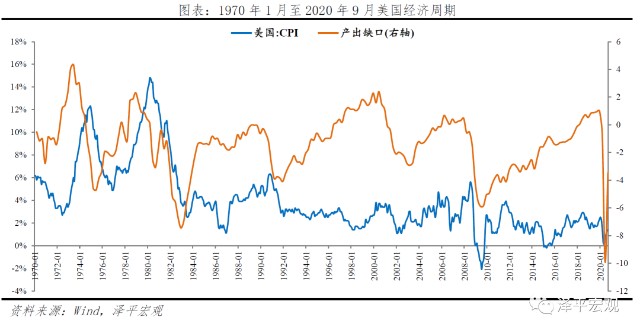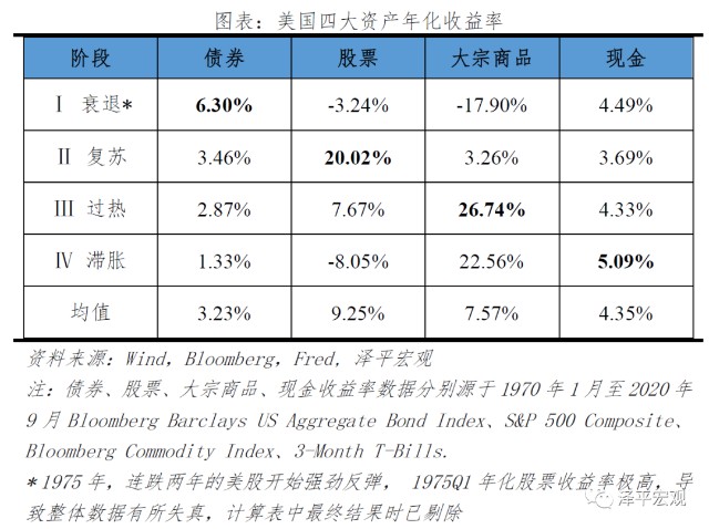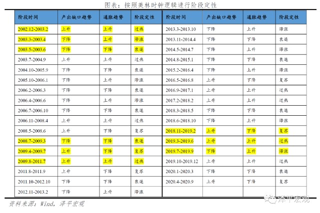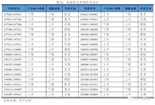 美林投资时钟本质上是一种基于需求侧变化的经济周期波动理论,背后的主要逻辑认为,基本面和货币政策相互作用形成短期经济周期,从而影响大类资产走势。投资者可以通过识别基本面和货币政策的重要拐点,在周期变换中把握趋势获利。从长期来看,长期经济增长与劳动、资本、技术、全要素生产率等生产要素相关;从短期来看,经济不会完全遵循长期经济增长路径,顺周期的行为产生的惯性会导致经济短期偏离潜在产出水平,而宏观调控政策则引导经济向潜在产出回归。比如,当短期经济疲弱,产出缺口恶化时,经济面临通缩压力,此时货币政策放松,刺激经济需求回升;当短期经济强劲,产出缺口向好时,经济面临通胀压力,此时货币政策收紧,需求回落。在经济短期波动与宏观调控共同作用下,经济周期形成不同阶段,大类资产出现趋势性轮动。 投资时钟可以帮助投资者制定行业战略,通过观察经济周期的变化,分析判断周期性、成长性、利率敏感性等行业的获利机会。经济增长变动影响投资周期性和防守性资产的收益,如经济增长加快时,有色、钢铁等周期性行业对应的股票和大宗商品表现好。通胀水平变动影响投资成长型或价值型的股票收益,通胀水平下降、贴现率降低时,久期长的成长型股票表现好。从衰退期中开始出现复苏迹象时,银行类、消费类股票等利率敏感型股票将率先反应。 2 美林时钟在美国基本符合经典理论 美林证券2004年的报告使用美国1973年3月至2004年7月的数据来实证检验理论的效果,本文参考美林投资时钟的方法,把时间范围扩展至1970年1月至2020年9月,检验美林时钟的适用性。 2.1 美国美林时钟的阶段划分 依照美林投资时钟,本文仍然通过产出缺口和通胀走势判定经济所处阶段,并对每阶段的四大类资产表现进行统计。 以产出缺口衡量经济增速,产出缺口是表示经济偏离可持续增长路径百分比的指标,美国经济在20世纪70、80年代以及2009年前后经历了较大的波动,其它时候大多是较小幅度的震荡。由于数据是不断震荡的,因此对每一次上升或下降都做区分没有意义,我们主要对6个月以上较长时段的趋势做上升或者下降的判断。 以同比CPI衡量的通胀数据,CPI是美联储和其它央行盯住的目标和划分通胀等级的依据,投资时钟要依此来预测央行的政策变动。美国的通货膨胀在20世纪70、80年代处于一个较高的位置,此后整体呈下降趋势。自2012年美联储明确2%的通胀目标以来,大多数时间未能实现该目标,因此2012年至今,除个别区间通胀明显上升至2%以外,CPI主要表现为下行趋势。 按照经济增长与通胀变化周期划分四个阶段,产出缺口与通胀同时下行为衰退,产出缺口上行通胀下行时为复苏,产出缺口与通胀同时上行时为过热,产出缺口下行通胀上行时为滞涨。为保持结果纵向可比性,本文使用的周期划分方式与美林投资时钟的基本一致,需要指出的是,自2008年金融危机后,美国经济的主逻辑是从衰退走向复苏,直至过热,考虑美国CPI的情况,结合美联储2%的通胀目标直至2017年才达到,2017年下半年开始退出量宽,2009-2017年中的经济周期主要以复苏周期为主。