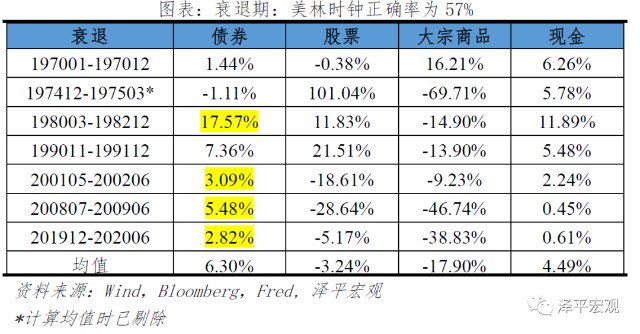 观测大类资产在各个阶段的表现也基本符合美林投资时钟结论, 1)在7个衰退期中,4个阶段债券收益率最高,5个阶段投资对立位置的大宗商品表现最糟糕。其中,1970年经济延续60年代末过热趋势,仍然体现为大宗商品收益率最佳。1974年12月至1975年3月,受到第一次石油危机重创,美国经济延续此前滞涨,因此现金收益率仅次于股票,而股票收益于宽松政策,强劲反弹。1990年11月至1991年12月,80年代末储贷危机引发股市崩盘,因此90年代的修复使股票收益高企,远超债券收益。
