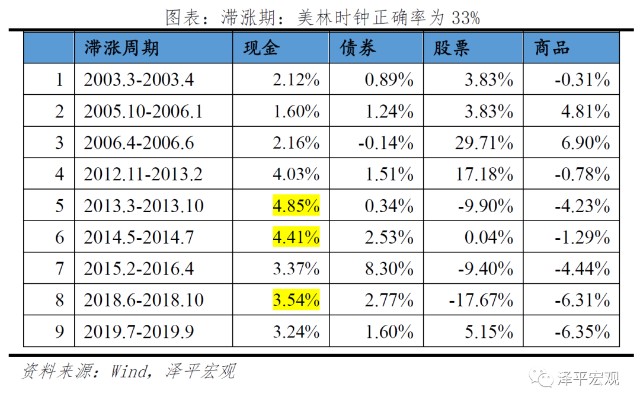 Ⅳ 滞涨期中,美林时钟正确率仅为33%,9个小周期中仅有3个周期现金收益率表现最好,其他在滞涨期表现较好的资产包括股票(4次)、债券(1次)、商品(1次)。