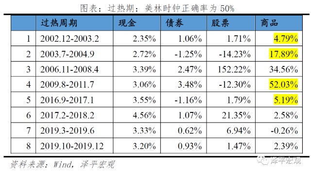 Ⅲ 过热期中,美林时钟正确率为50%,8个小周期中有4个周期商品收益率表现最好,其他在过热期表现较好的资产包括股票(3次)、现金(1次)。