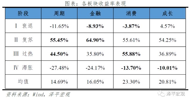 Ⅰ 衰退:金融和消费板块在衰退阶段抗跌能力最强。衰退期时期宽货币,银根放松,利率敏感型的金融、消费类股票领跑。在6个衰退期中,3个阶段金融板块收益率最高,5个阶段消费板块收益率第2,二者均值分别为-8.9%、-3.9%。成长板块受2019年11月-2020年2月5G牌照发放、科创板推出等利好影响,均值超过金融和消费板块。 Ⅱ 复苏:周期和金融板块是复苏阶段的最佳选择。宽货币宽信用下,各大板块同时受益于盈利改善和估值上升,股市呈现普涨。因此,对景气度上行弹性最大的周期板块,对流动性宽松弹性最大的金融板块收益率最佳。在6个复苏期中,4个阶段金融板块收益率最高,5个阶段周期板块收益率第2,二者均值分别为64.9%、55.5%。 Ⅲ 过热:周期和消费板块是过热期表现最佳的。过热期对应紧货币宽信用,实体经济仍然景气,但是流动性转向,利率抬升导致金融资产估值下行,股市呈结构性行情。周期板块盈利仍处高位,消费板块现金流较为稳定,对流动性收紧相对不敏感,收益率较高。在7个过热期中,5个阶段消费板块收益率靠前,消费和周期板块收益率远高于其他两个板块,高达55.9%、44.5%。 Ⅳ 滞胀:消费和成长板块在滞胀阶段相对抗跌。紧货币紧信用阶段,实体景气下滑,企业盈利恶化,利率上升、估值收缩,股票市场整体表现糟糕。其中,伴随政策对通胀的控制,折现率有所下行,长久期的成长股价值提升明显,相对抗跌。而消费板块由于现金流较为稳定,表现相对抗跌。在7个滞涨期中,4个阶段成长板块收益率相对更好,6个阶段消费板块收益率靠前,二者平均收益率的负值远小于其他板块,最为抗跌。