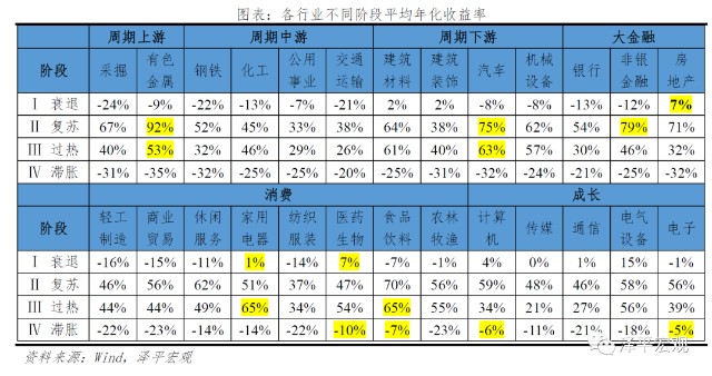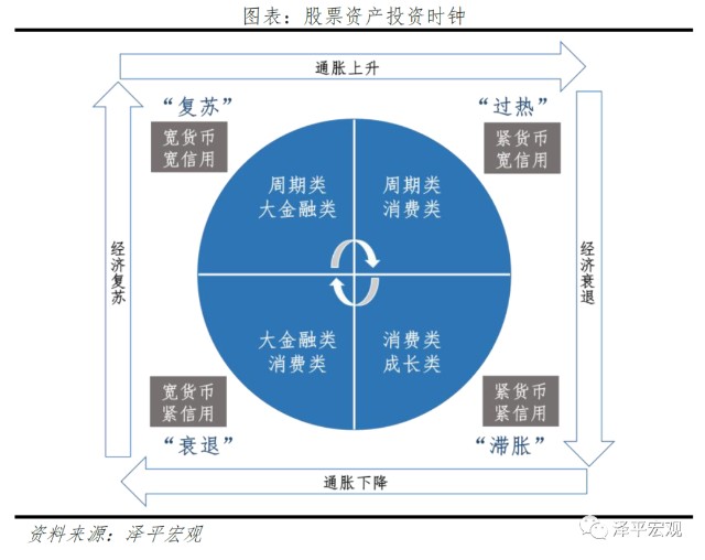 股票:1)衰退期,金融和消费板块抗跌能力最强;2)复苏期,周期和金融板块是最佳选择;3)过热期,周期和消费板块表现最为强势;4)滞涨期,消费和成长板块最为抗跌。
