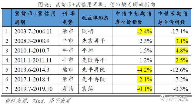 Ⅳ 滞胀:债券缺乏明显趋势,需要相机抉择。在滞涨期(紧货币+紧信用),牛市占比43%,熊市占比43%,震荡市占比14%,债市缺乏明显趋势。此时债券市场无明显的配置策略,从历史周期划分来说,紧货币紧信用周期下,无论当期为熊市、牛市或震荡市,有5/7的情况在下一周期演变为牛市,因此结合基本面情况,如果预期经济下行,货币政策放松,此时拉长久期有利于博得未来超额收益。