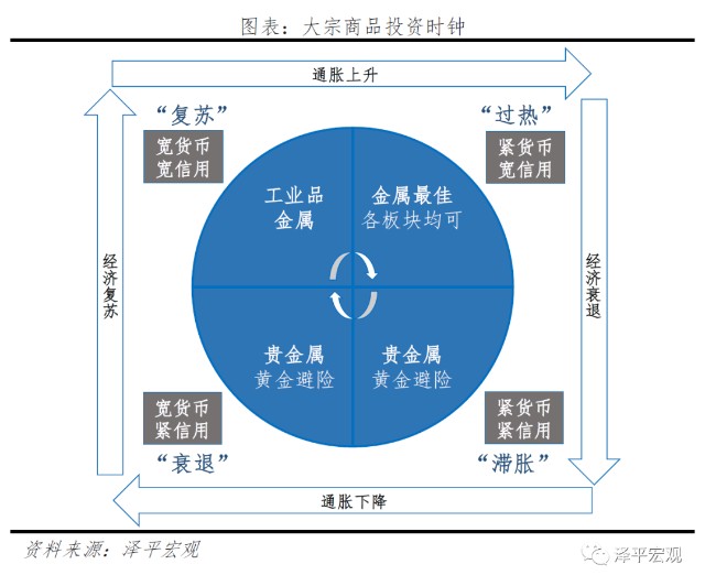 商品:1)衰退期,贵金属表现最佳;2)复苏期,工业品整体表现不错,金属板块是最佳选择;3)过热期,金属板块表现最佳;4)滞涨期,贵金属最为抗跌。