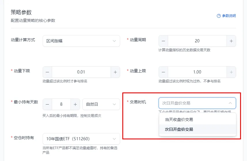 【T+1日成交】在第一天收盘的时候计算动量,第二天早上开盘先卖后买。如果第二天开盘去成交,开盘的时候会高开和低开。你就需要尽快去成交,没有那么多时间给你犹豫,不过你可以准备2份资金挂隔夜单。