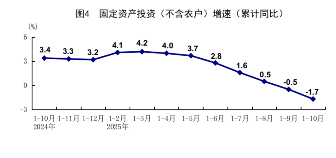 投资整体下滑:1-10 月固定资产投资同比降 1.7%,主要是房地产拉后腿 —— 房地产投资降 14.7%,新房销售面积和销售额也分别降了 6.8%、9.6%。【以前靠房地产拉动,现在房地产已经死了】